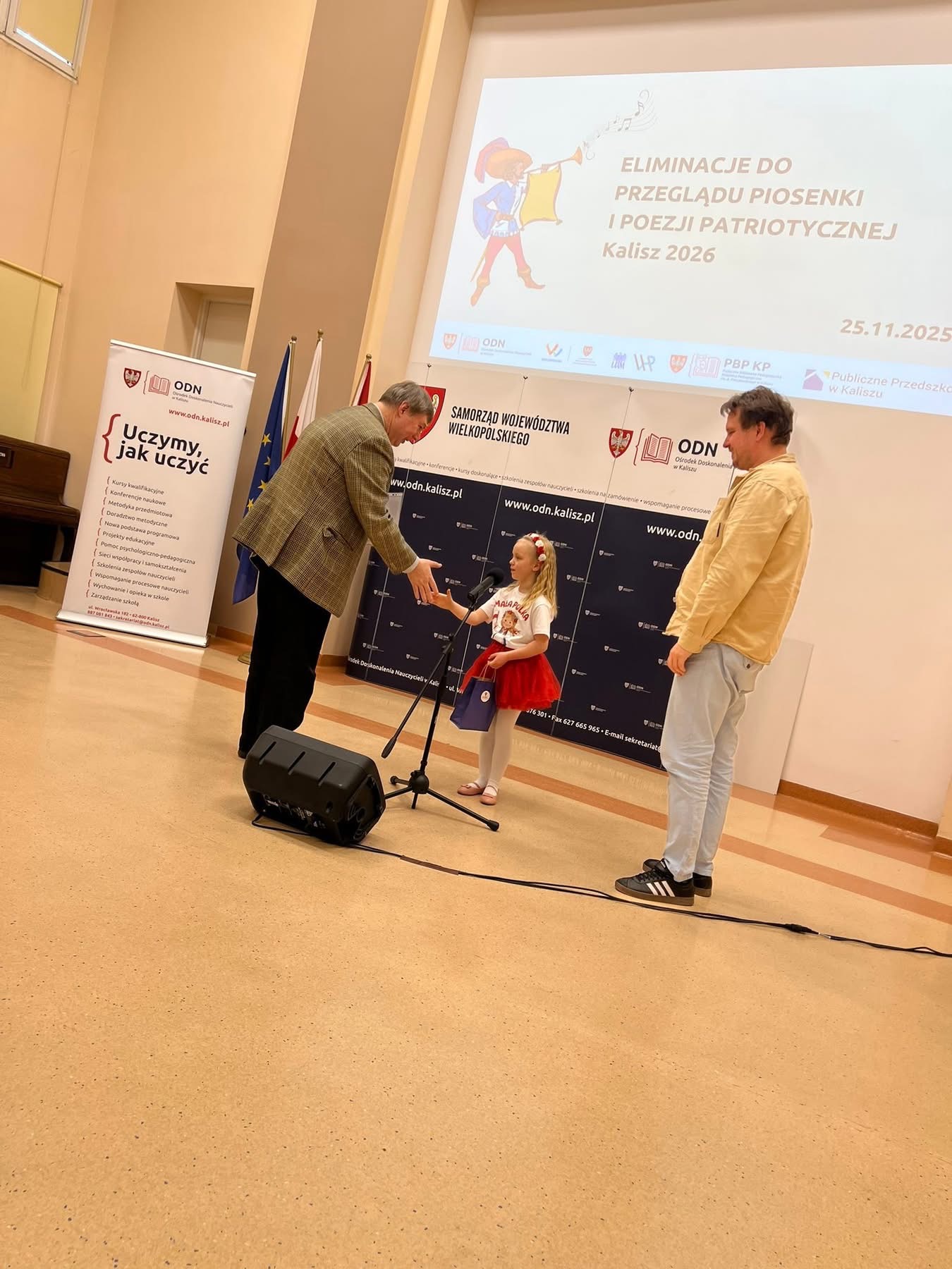 W dniu dzisiejszym nasze wychowanki: Lilianna Kieliszkowska z grupy „Biedronki” oraz Nataszka Czarnojanczyk z grupy „Pszczółki” zaprezentowały swój talent wokalny oraz recytatorski w Eliminacjach do konkursu Przeglądu Piosenki i Poezji Patriotycznej w ODN w Kaliszu, której organizatorem jest Publiczne Przedszkole nr.9 w Kaliszu ? Serdecznie gratulujemy pięknych występów naszym dziewczynkom ??? Czekamy z niecierpliwością na jutrzejszy werdykt Szanownego Jury ?